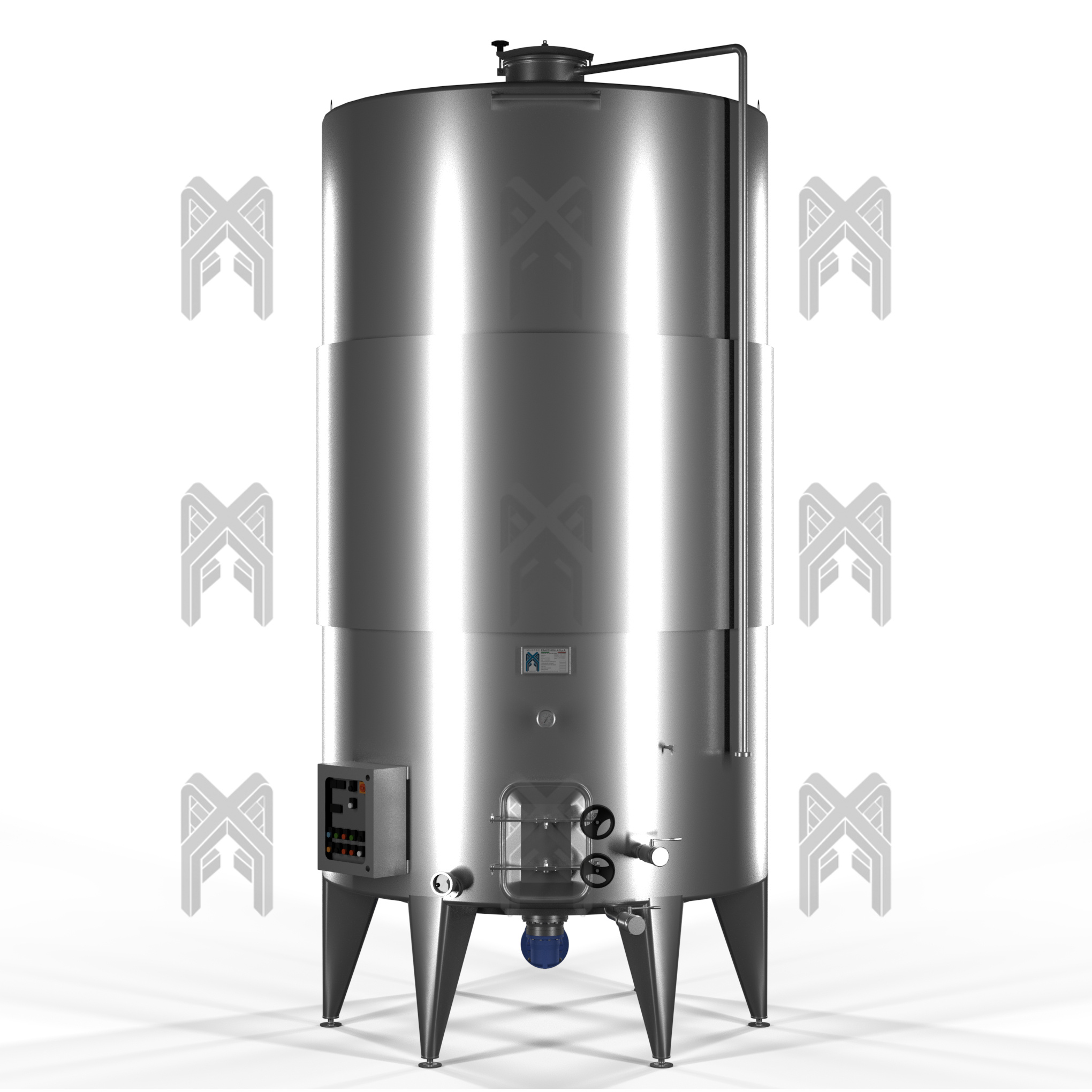Dotato di pale di estrazione azionate da motoriduttore per l’estrazione automatica delle vinacce e di tubo di rimontaggio vinacce con diffusore statico.